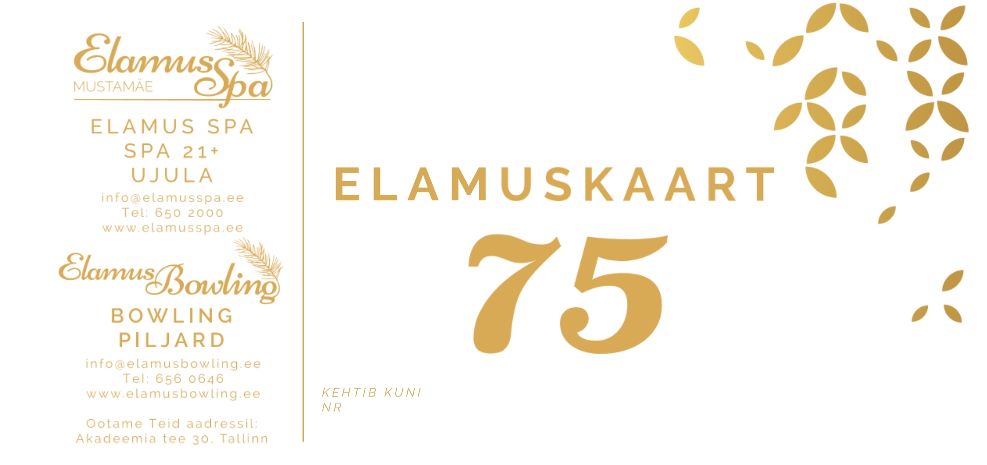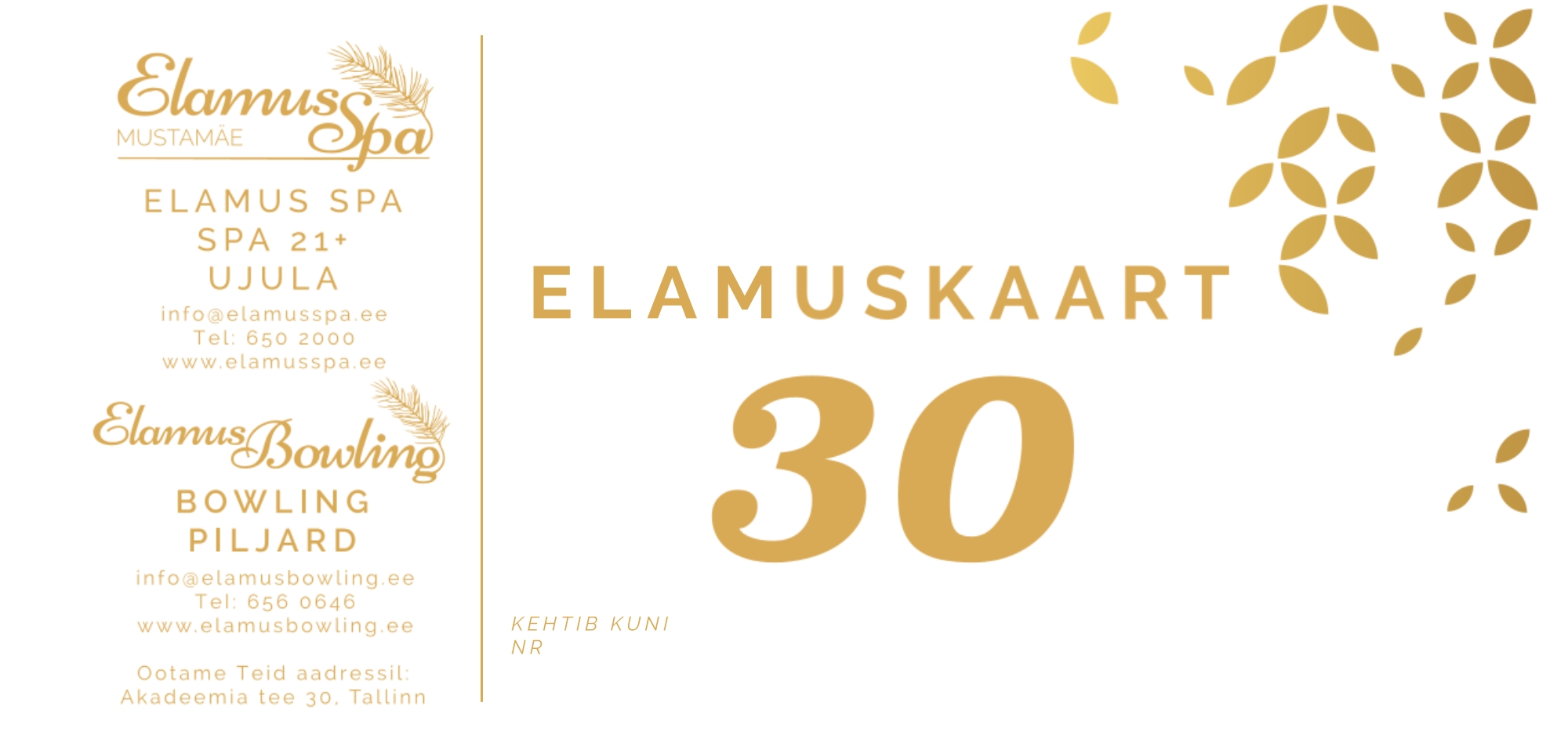 Elamuskaardid erinevas väärtuses on saadaval onlines, Elamus Spas ja Elamus Bowlingus.